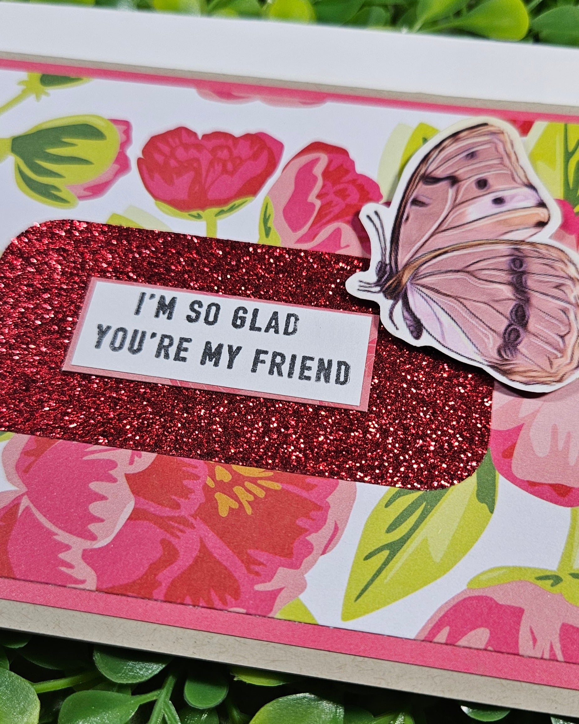 A springtime floral card that will remind your friend how much they mean to you. Perfect for many occasions this card features a beautiful butterfly on a floral background and a little sparkle.