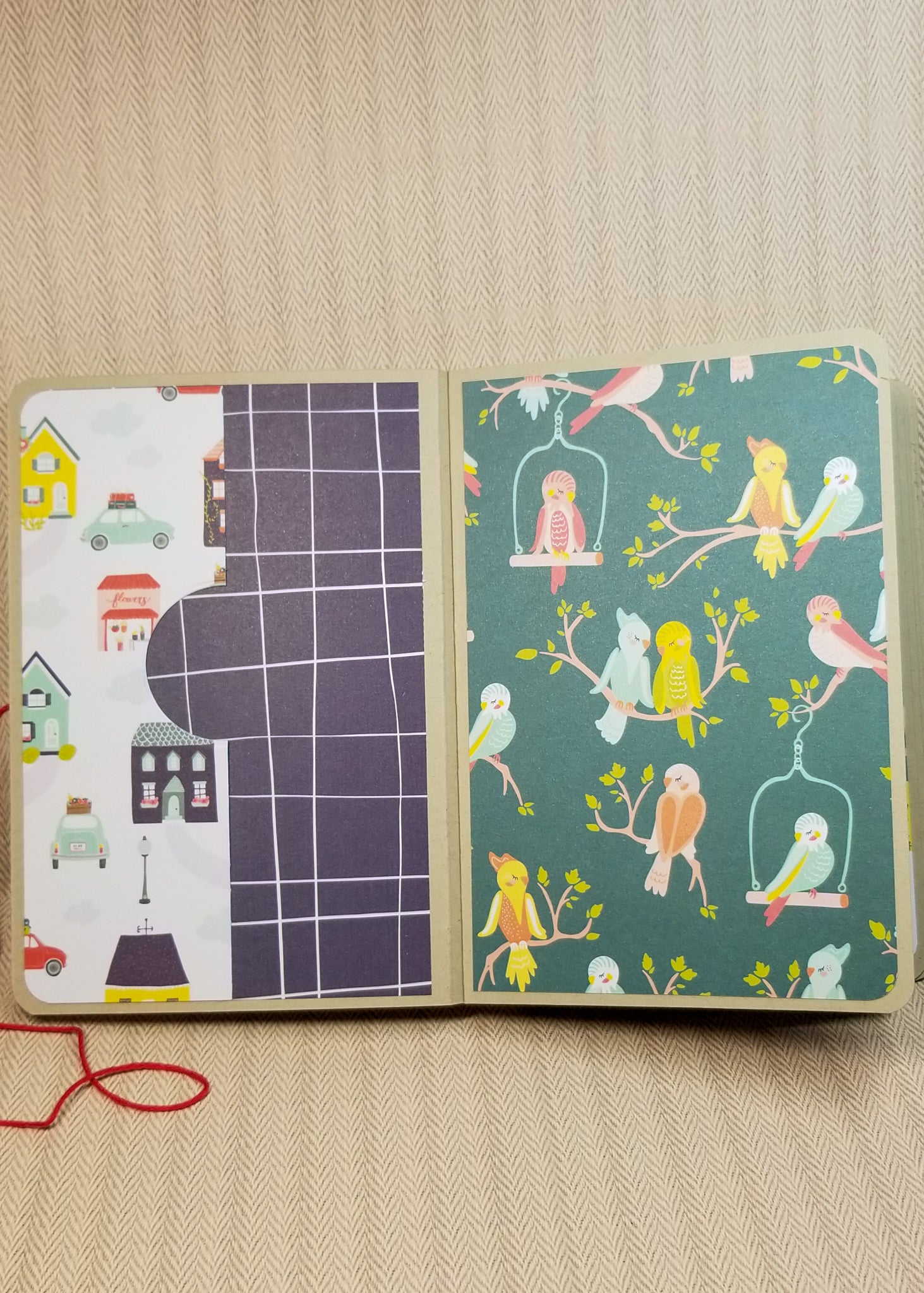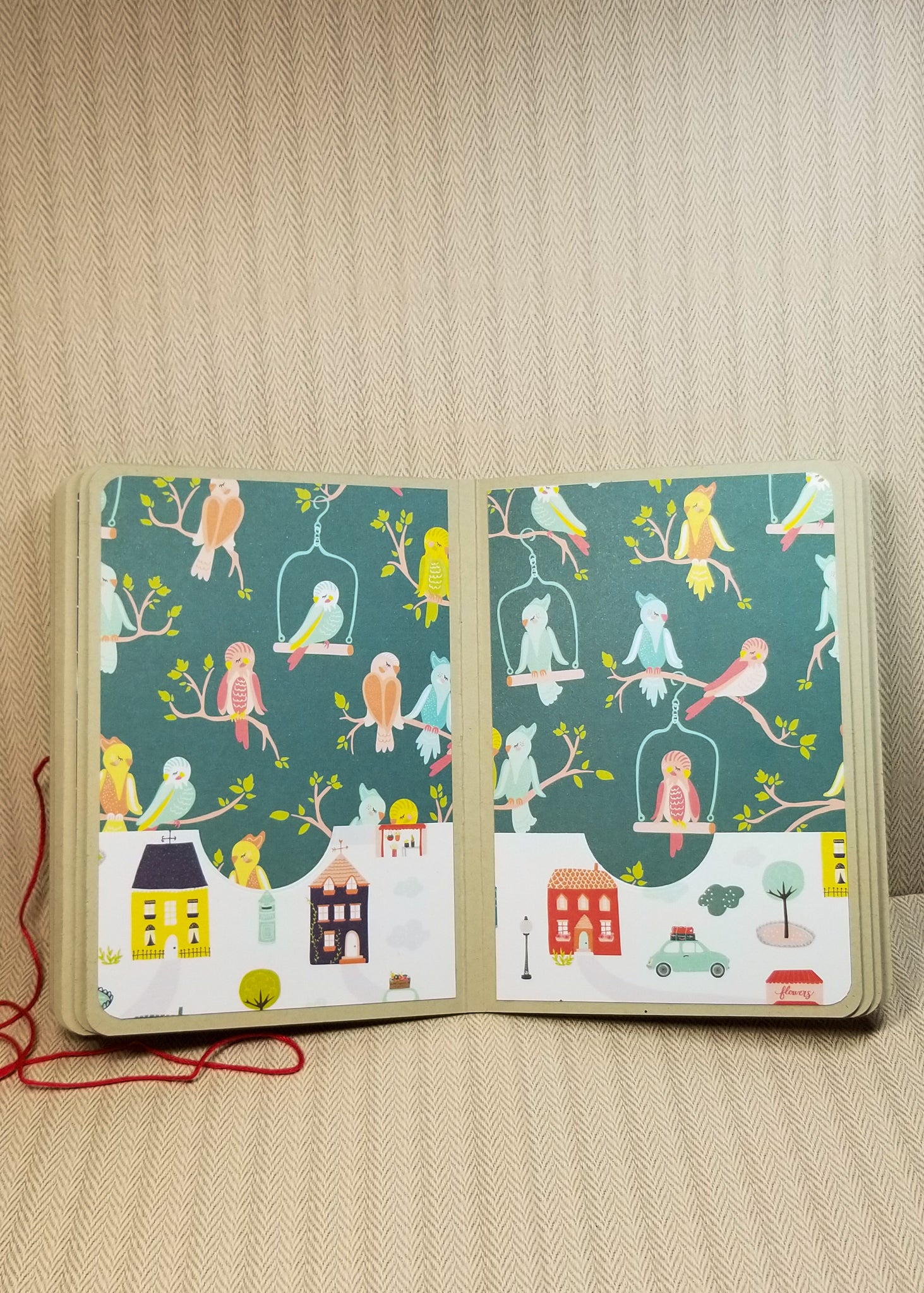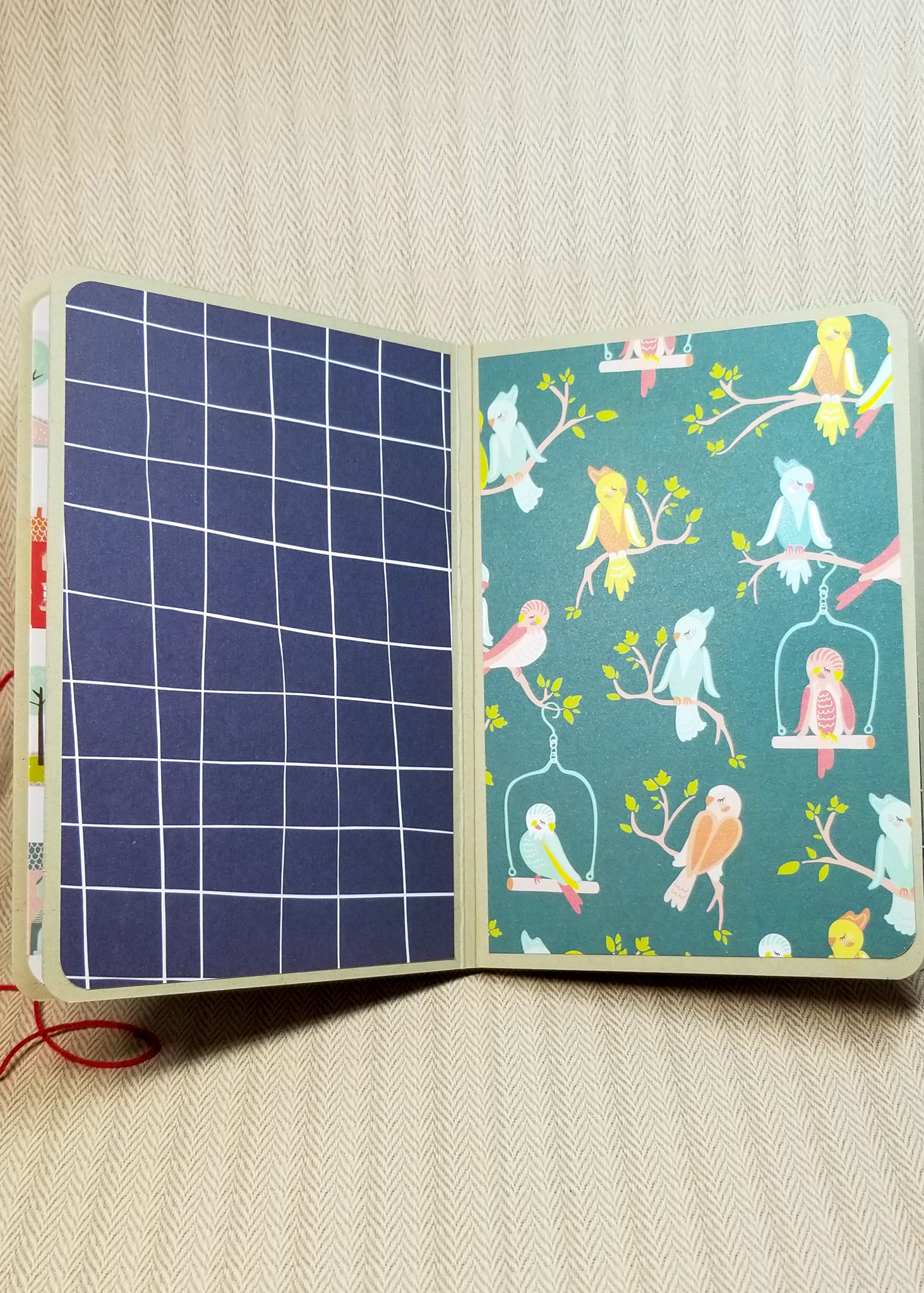 The album is handmade from cardstock and 4 different patterned papers. Mats in the album measure 4" x 6" and all pages, including the cover, have rounded corners to minimize damage to them. There are 18 pages for you to have fun with and decorate to your heart's content. The album closes by wrapping the red string around the back of it to the front and then securing around the brad.