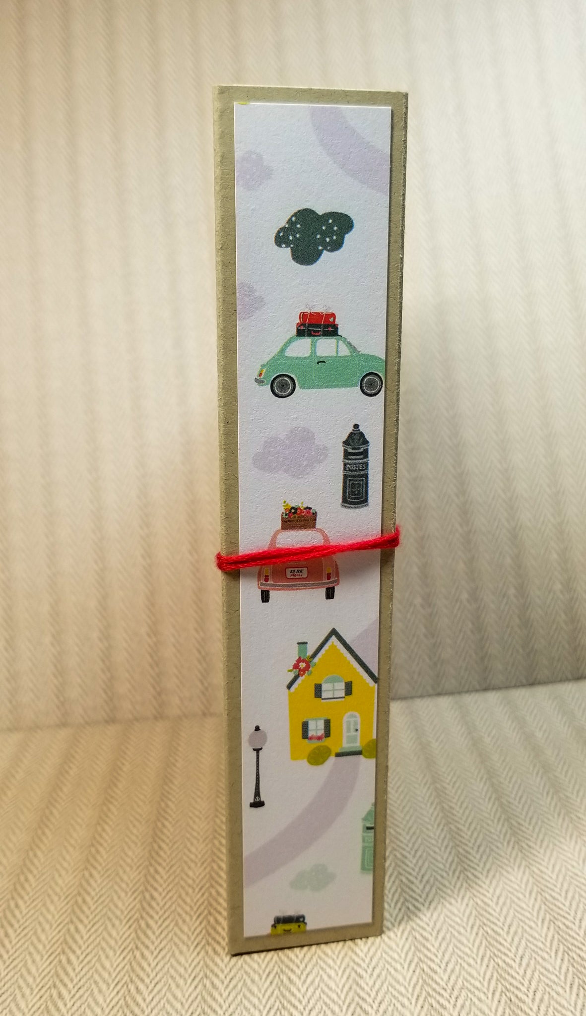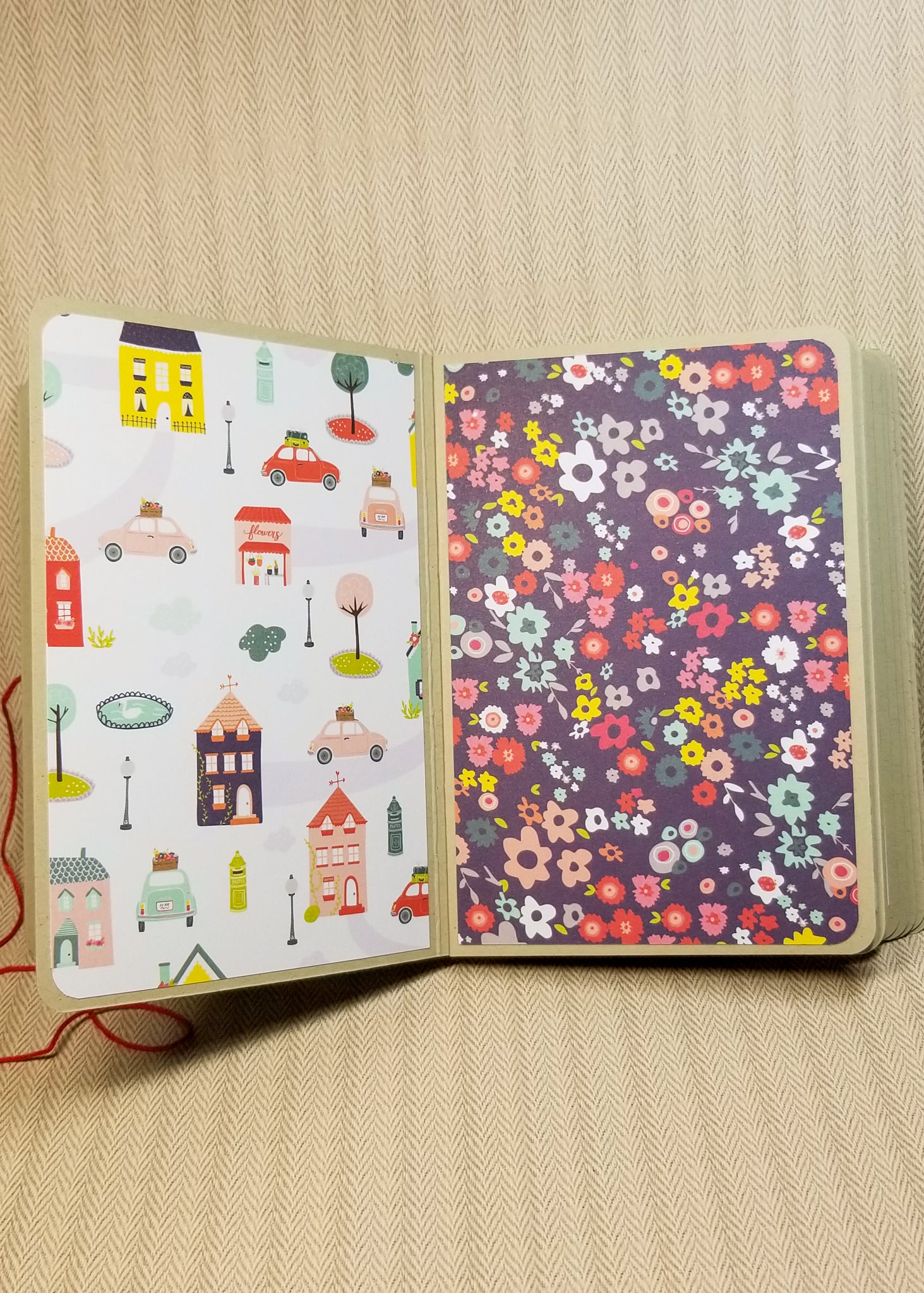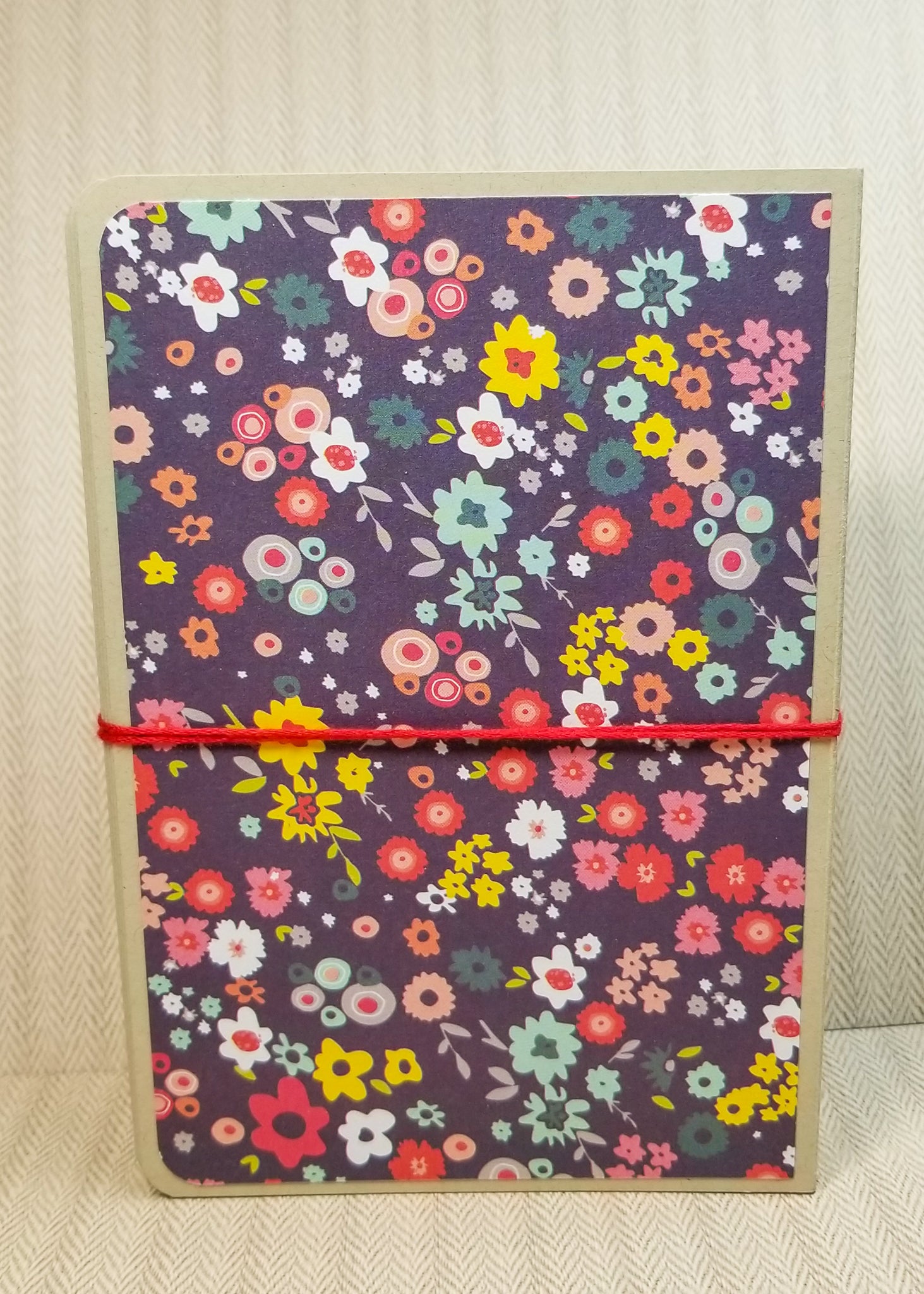 The album is handmade from cardstock and 4 different patterned papers. Mats in the album measure 4" x 6" and all pages, including the cover, have rounded corners to minimize damage to them. There are 18 pages for you to have fun with and decorate to your heart's content. The album closes by wrapping the red string around the back of it to the front and then securing around the brad.