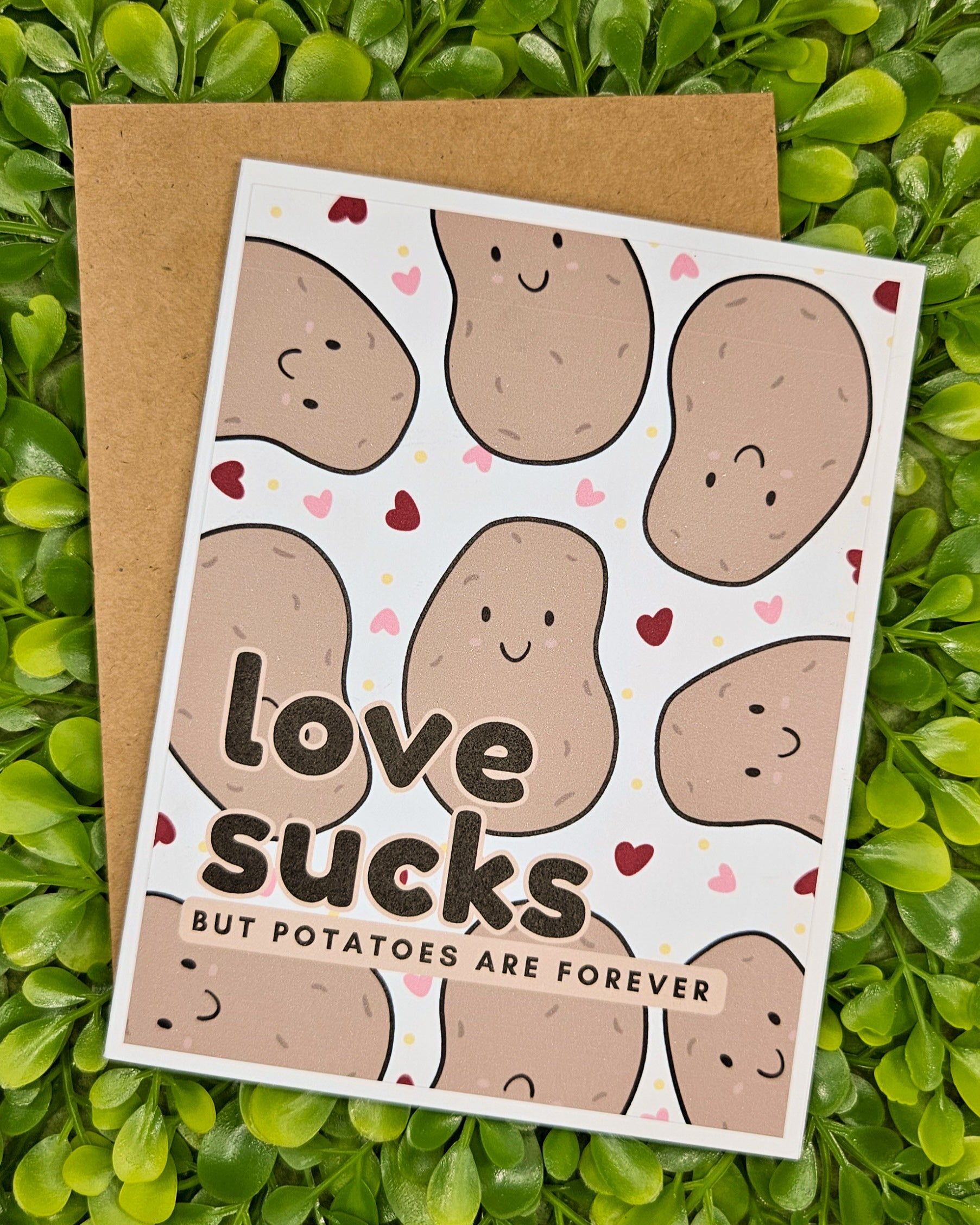 - (1) Funny Anti-Valentine’s Day Card – “Love Sucks… But Potatoes Are Forever” featuring cute, smiling potatoes. Printed on high-quality cardstock and blank inside for your own sassy message. It includes an envelope.