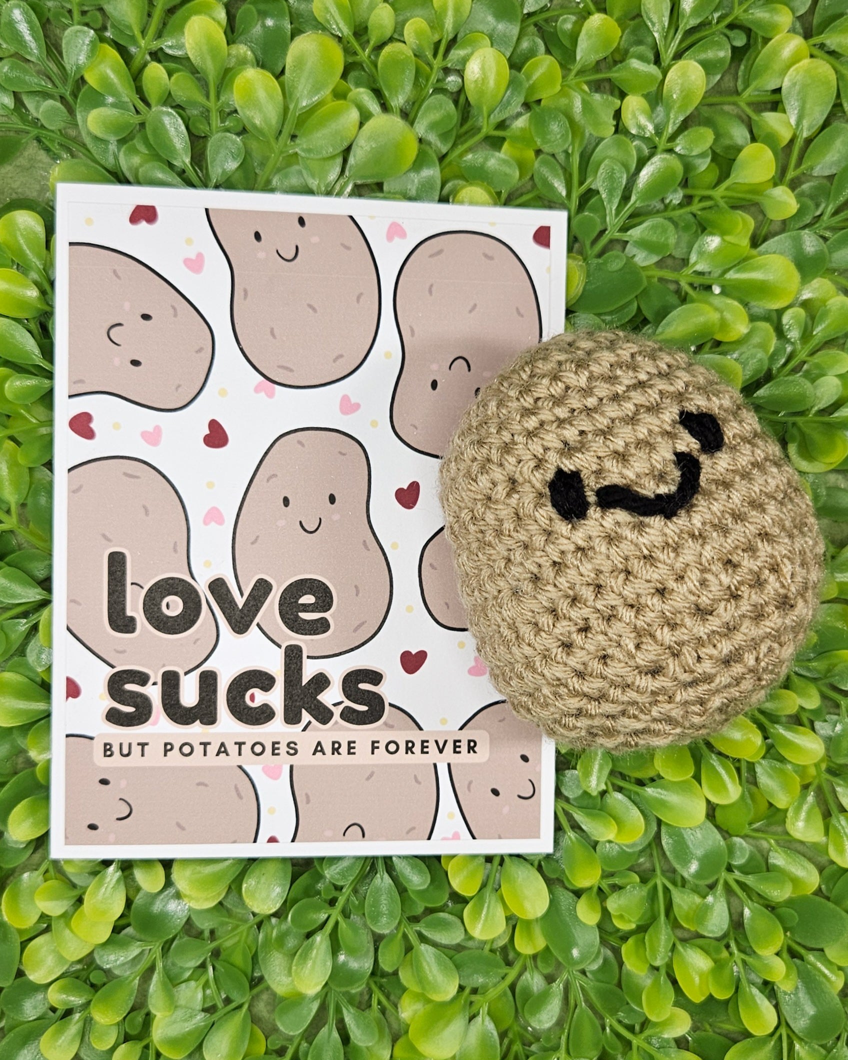 Why settle for love when you can have potatoes? This Anti-Valentine’s Day Gift Bundle is perfect for potato lovers, singles, and anyone who thinks all forms of potatoes beats romance any day. Featuring a handmade crochet potato plush and a funny, sarcastic greeting card, this bundle is a must-have for your bestie, Galentine, or any singles!