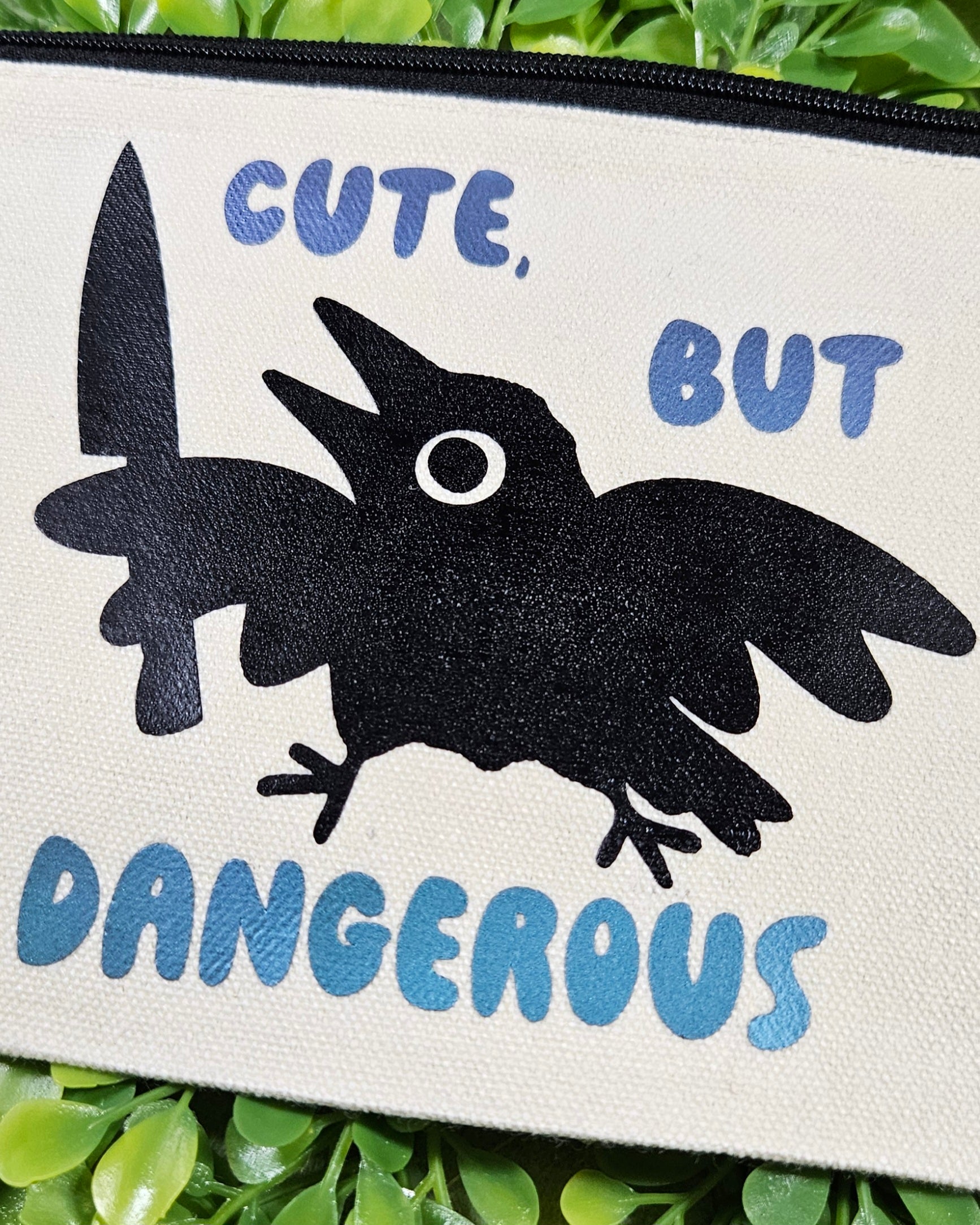 The bold and quirky design is sure to catch the eye with a murderous, yet adorable little crow. This makes a great gift for anyone on the go - whether a journaling fiend, cosmetic makeup lover, or traveler. Anyone who loves cute but dangerous animals with knives will surely get a kick out of it.