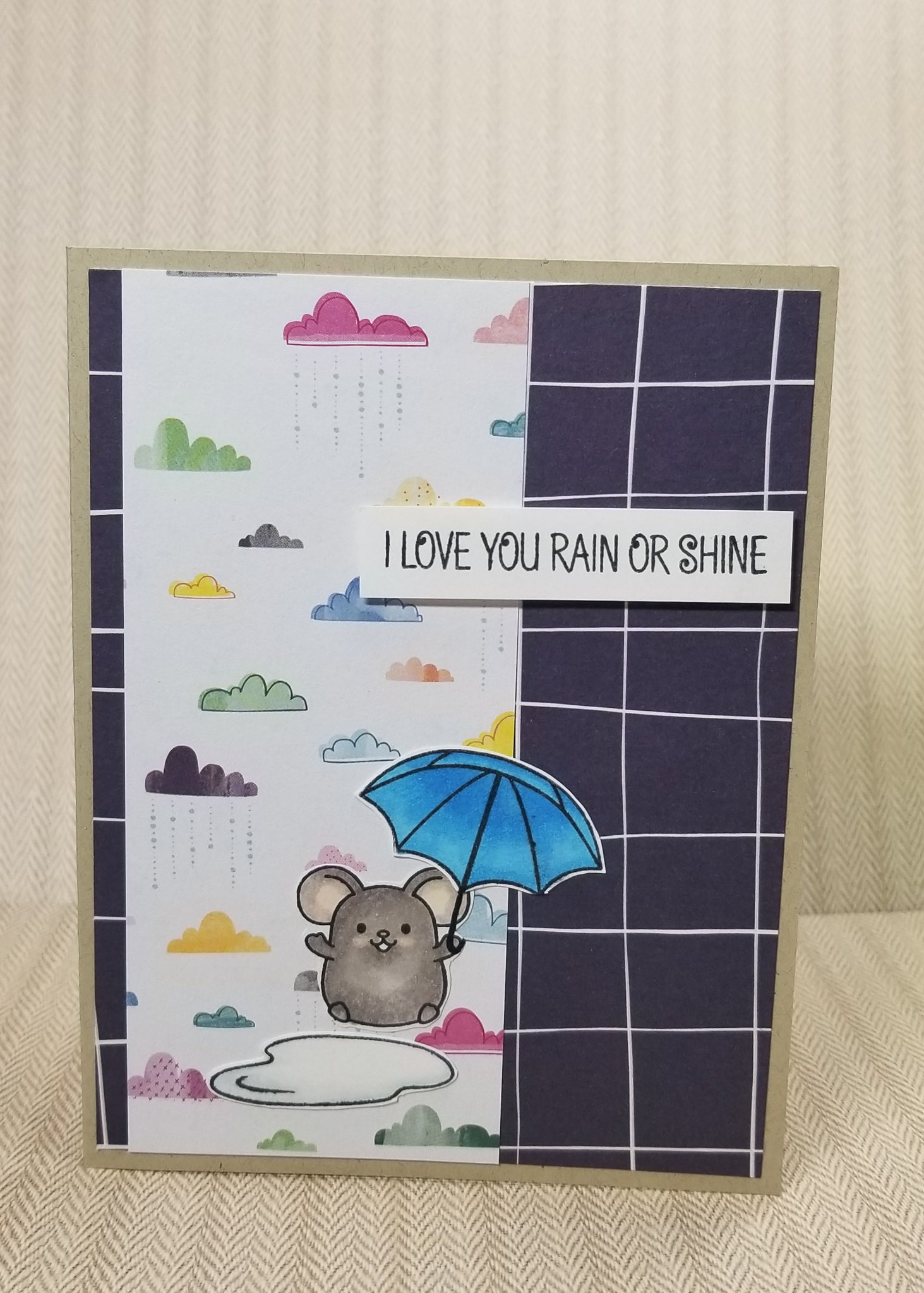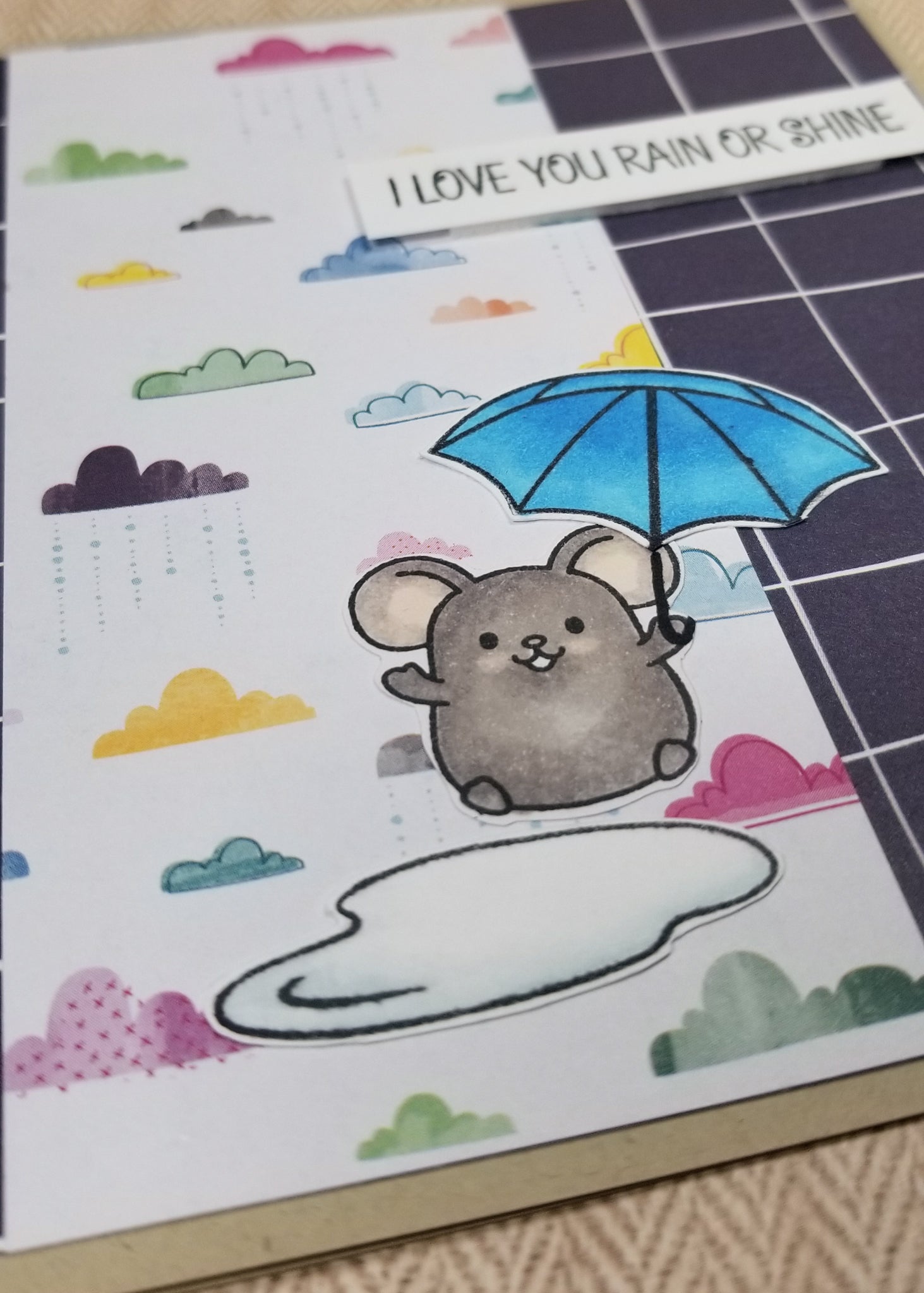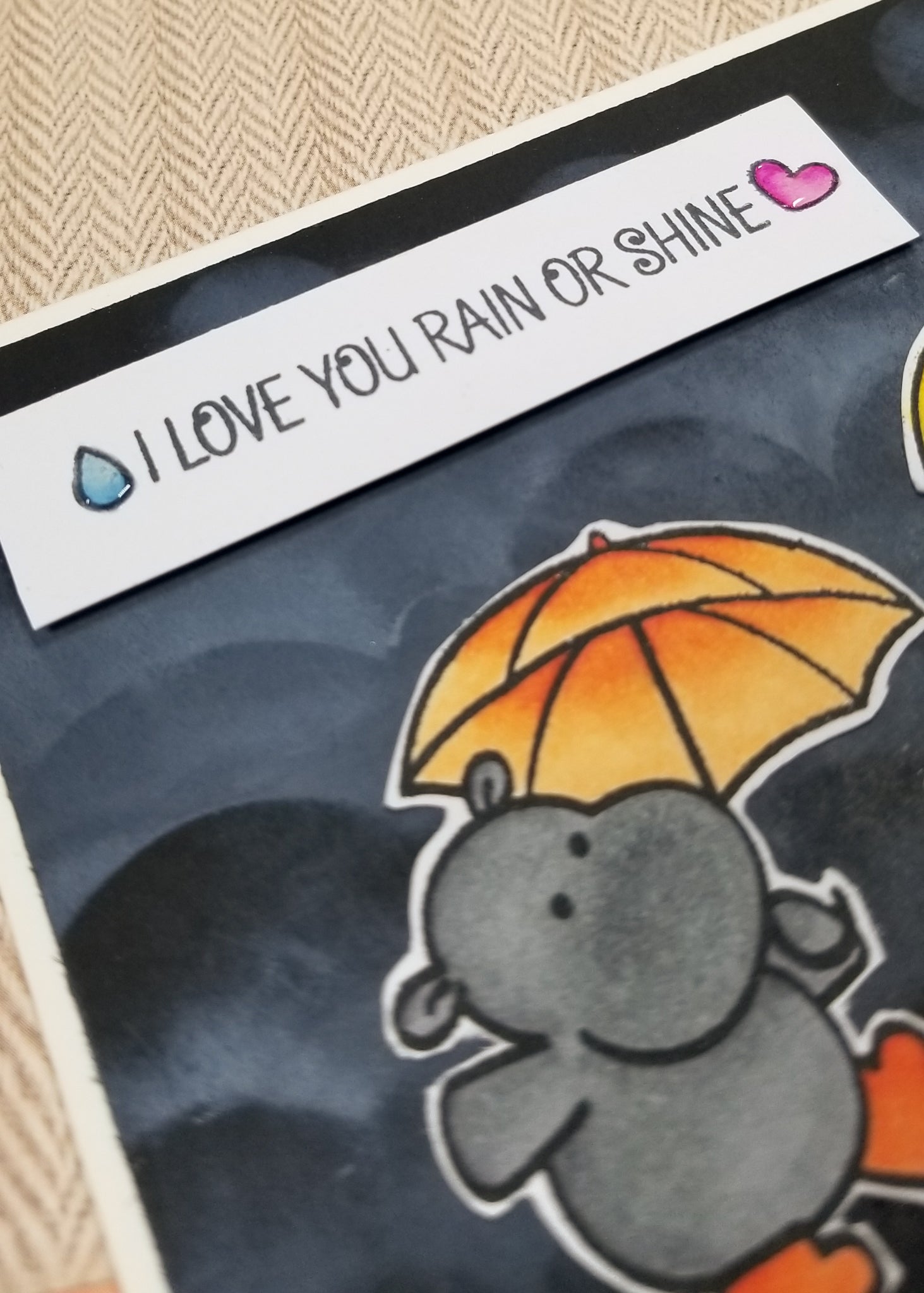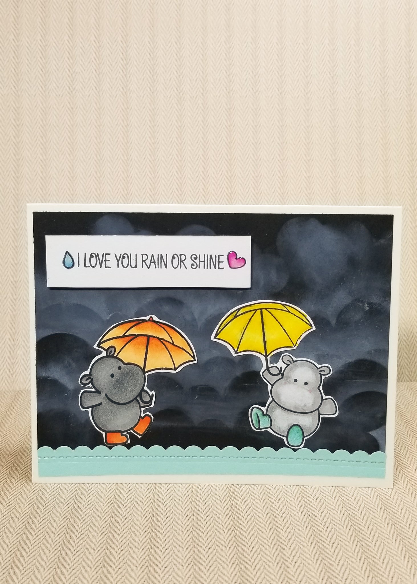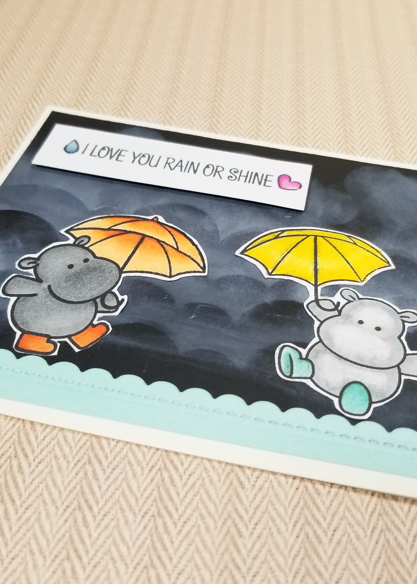 The hippos are hand-stamped and colored on an ink blended stormy background. The sentiment has a raindrop and heart that have a 3D element to them.